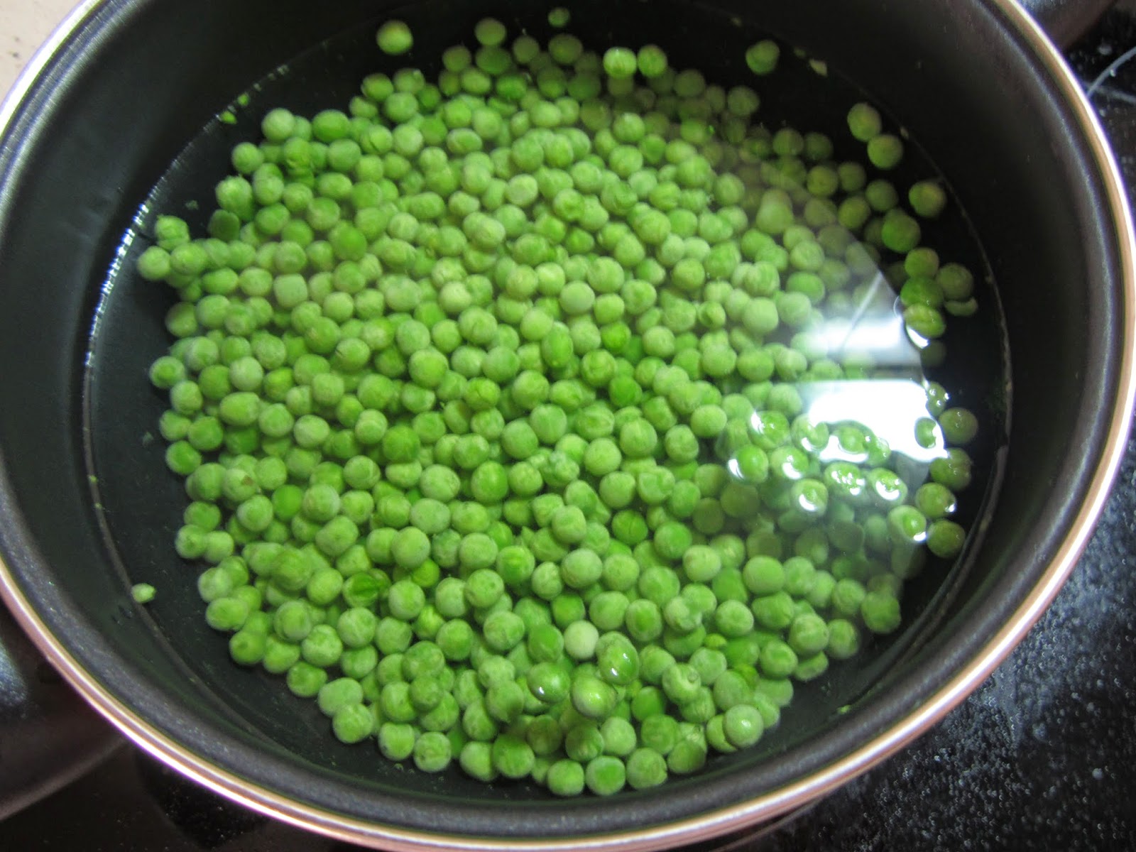 Ponemos a hervir los guisantes con agua y sal hasta que estén tiernos y reservamos.