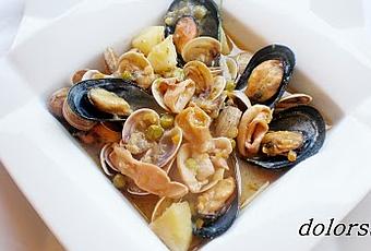 Ingredientes para 4 personas:1kg. de chipirones limpios¾ Kg. de mejillones¾ kg. de almejas½ cebolla1 zanahoria½ pimiento verde italianounos guisantes3 patatas 100 cc. de vino blancosal, pimienta blancaunas hebras de azafrán1 ajo, perejilaceite de oliva virgen extraAbrir los mejillones limpios en el microondas. Reservar el caldo colado. Desechar la valva vacía.
