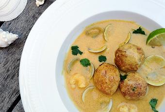 GUISO DE ALMEJAS CON GAMBAS BLANCAS Y ALBONDIGAS DE PINTARROJA EN SALSA DE ANACARDOS.