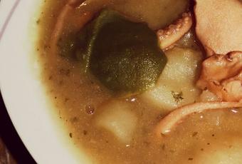 Sofreímos en una olla con el aceite, el ajo y la cebolla picados, añadimos el calamar y rehogamos todos unos cinco minutos, añadimos el vino, y rehogamos cinco minutos más, a continuación añadimos las patatas, el pimiento, sal, cúrcuma, albahaca, perejil y el agua, y cocinamos a fuego medio durante media hora.