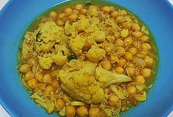 En este caso se trata de una receta improvisada... ¿¿qué cocinar cuándo sólo tienes en la nevera una coliflor, un bote de garbanzos cocidos en la alacena, unos fideos y montones de especias??