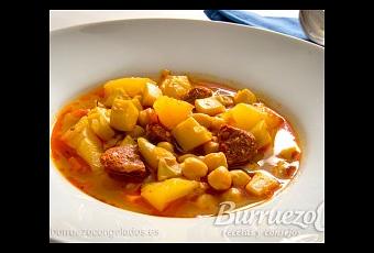 Lavar la sepia, eliminar su boca y partir, primero en tiras y posteriormente en dados. Incorporar al sofrito y cocinar unos minutos. Añadir el pimentón y las otras especies, el laurel, la ñora, los garbanzos, las patatas peladas y partidas con 600 ml de agua.