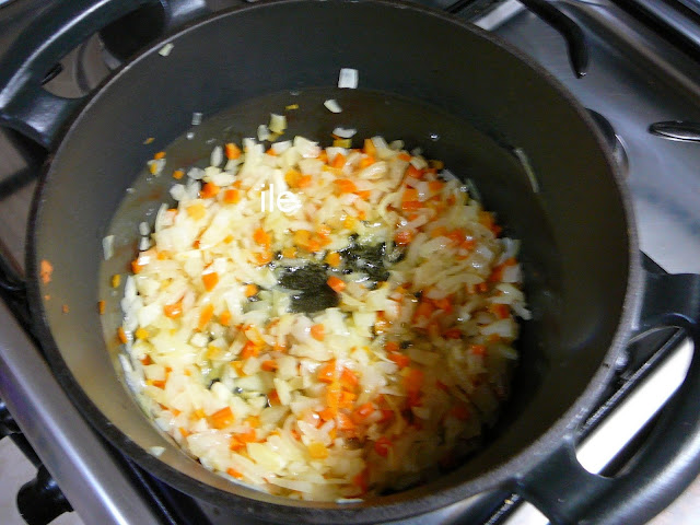 En una cacerola, pongo un poco de aceite, y corto la cebolla bien chiquita, la zanahoria y el morrón o pimiento rojo (no se porque apareció mi morrón en el freezer, así que no lo usé), y pico dos dientes de ajo. Pongo a rehogar la verdura hasta que está tierna, y un poco transparente.