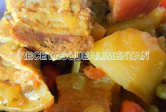 300 panceta fresca, 300 gr. panceta curada, un kg. patatas, una cebolla, un pimiento verde, un tomate, una zanahoria, 200 gr. de guisantes, 3 dientes de ajo, 2 hojas de laurel, perejil, azafrán, pimentón dulce, pimienta negra en grano,100 ml. vino blanco, aceite de oliva, agua, sal.