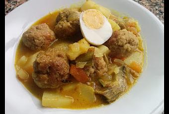 NÚMERO DE PERSONAS4TIEMPO DE PREPARACIÓN40 minutosMATERIAL NECESARIOCuenco grande, sartén, cacerola, plato, tabla, vitro, cuchillo, mortero, cucharón de maderaINGREDIENTESALBÓNDIGAS500gr de carne picada1 huevo1 taza de pan rallado1 cucharada de perejil picado1 cucharada de queso parmesano ralladoUna pizca de pimienta negra molidaUna pizca de ajo en polvoACOMPAÑAMIENTO2 patatas grandes1 cebolla pequeña1 tomate maduro15 almendras1 diente de ajo2 zanahorias4 alcachofas4 huevos100gr de guisantesunas hebras de azafráncúrcumaaguaaceitesalPREPARACIÓN