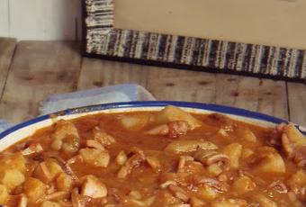 INGREDIENTES4-5 patatas1 cebolla2 dientes de ajo1/2 pimiento verdechorrito de brandychorrito de vino blanco500 gr. de potauna cucharadita de pimentónuna guindilla cayena pequeñasal y aceite de oliva