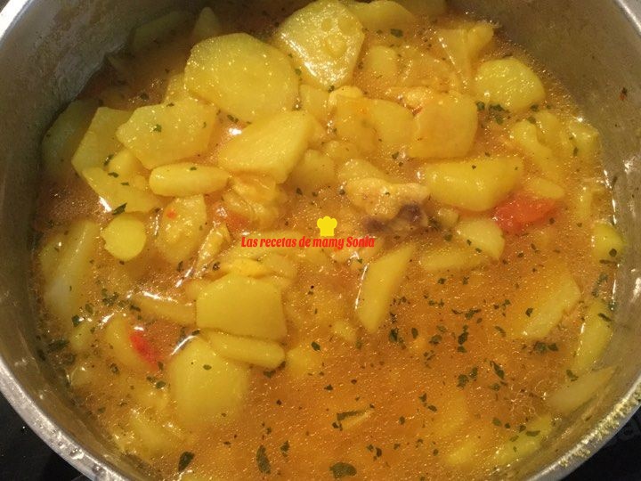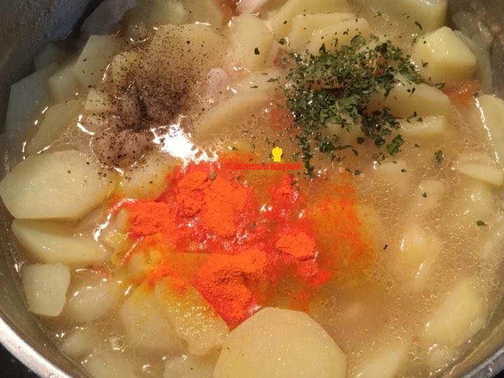Lo agregamos de nuevo a las patatas, junto con la sal, la pimienta, el perejil y el azafrán o colorante, mezclamos y dejamos que los sabores se integren y el caldo se consuma un poco