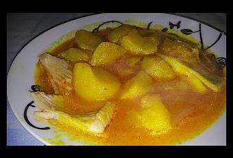 Elaboración: Primero preparamos el refrito en una sarten a fuego medio con un poco de aceite de oliva virgen y las hortalizas picadas, cuando el tomate empiece a deshacerse agregar el vino fino. Mientras se hace ponemos en una olla grande el pez raya en trozos a hervir con patatas peladas y troceadas, sal y el laurel. Una vez listo el refrito se lo agregamos a la cocción del pescado, a continuación agregamos el zumo de limón, el pimenton y la pizca de pimienta negra. Dejamos cocinar durante 30 hora a fuego lento. Antes de servir agregar las ebras de azafrán.