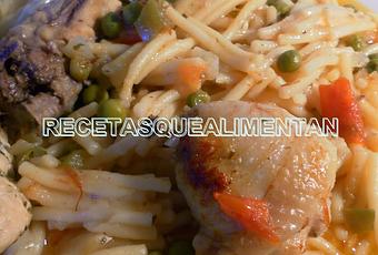 Un pollo de 1, 5 kg., 300 gr. fideos, una cebolla, un tomate, un pimiento rojo, 2 zanahorias, 200 gr. guisantes, 3 dientes de ajo, un manolo de perejil, una cucharadita de pimentón dulce, 2 cucharaditas de colorante, 100 ml. vino blanco, aceite de oliva, pimienta negra molida, agua, sal.