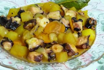 Ingredientes:PulpoZanahoriaCebollaPatataHoja de laurelSalazafrán