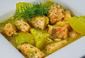 1- Quitar la piel y espina del salmón, cortar en dados, salpimentar y espolvorar eneldo. Reservar.