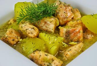 5- Despresurizar, rectificar de sal, agregar el salmón, válvula cerrada, menú guiso, 1 minuto, 110º, media presión. Dejar que despresurice sólo, así se termina de hacer el pescado y servir, espolvoreado de eneldo.