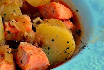 - Añadir 300 grs. de salmón fresco cortado en dados (limpio de piel y espinas), y dejar cocer suave unos 5 minutos y servir.