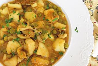 800 gr. de sepia limpia1 cebolla1 pimiento verde italiano1 c/s de tomate frito100 cc. de vino blanco3 patatas150-200 gr. de guisantes500-600 cc. de caldo de pescadoLaurel, sal, pimienta negra1 diente de ajo, perejilUnas hebras de azafrán1 c/p de pimentón dulceAceite de oliva virgen extraEn una cazuela con un poco de aceite pochar la cebolla picada, sal y dejar unos 5 minutos.Incorporar el pimiento verde picado, rehogar el conjunto unos 8-10 minutos.Agregar el tomate frito, dar unas vueltas y poner las sepias cortadas en trozos más o menos de bocado.Verter el vino blanco, la hoja de laurel, las patatas peladas lavadas y chascadas, los guisantes y dar unas vueltas a todo el conjunto.Verter el caldo de pescado que esté muy caliente, rectificar de sal y pimienta y cocinar durante unos 15 minutos.En un mortero picar el diente de ajo, unas hojas de perejil, el azafrán y el pimentón, añadirlo al guiso y dejar 10 minutos más para que hermanen los sabores y terminen de cocoerse las patatas. Si empleáis ** Para chascar las ** Los ** El