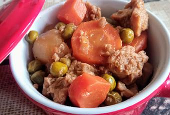 Incorpora las hojas de laurel, las patatas, los guisantes y la soja texturizada escurrida. Remueve y deja que se cocine todo a fuego lento unos 20 minutos.