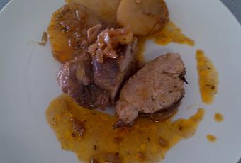 En un bol, mezclaremos el pimentón, la pimienta y el tomillo y removeremos bien; a continuación espolvorearemos el solomillo con la mezcla y lo pasaremos un poco por harina, con esto conseguiremos que la salsa espese un poco durante la cocción. A continuación picaremos la cebolla y el ajo muy finamente y la sofreiremos, en una olla baja, durante un minuto; seguidamente agregaremos el solomillo entero y lo sofreímos con la cebolla dándole vueltas. Cuando se vaya dorando un poco la parte de afuera será el momento de agregar las rodajas de patata, les daremos una vuelta y agregaremos entonces el vaso de vino tinto y agua hasta que las patatas queden cubiertas con el caldo. El cerdo se cocina rápido y las patatas al estar en rodajas también lo harán por lo que en 25 minutos puede estar cocinado, según el tamaño del solomillo. Cuando empiece a hervir probaremos para saber si le hace falta un poco más de especias. Recuerda que estas especias serán el sustituto de la sal, por lo que asegúrate de especiar a tu gusto, incluso si eres de los que te gusta el picante, puedes echar al sofrito un poco de pimienta de cayena. Durante la cocción daremos un par de vueltas al solomillo y a las patatas para que la misma patata ayude a ligar la salsa. Para servir cortaremos el solomillo en rodajas más bien gruesas y acompañaremos con las patatas y un poco de la salsa. Cuidado con la salsa si tienes restricción de líquidos, con un poco sera suficiente para que quede gustoso. Espero os guste, es muy fácil de hacer. ![]() ![]() |