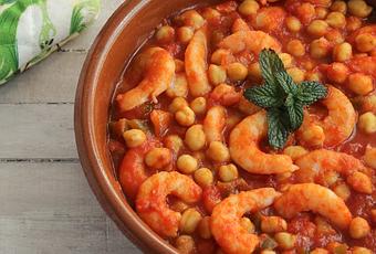 Guiso marinero de garbanzos con langostinos. Hace unos días me tomé una cerveza con unos amigos a los que hacía tiempo que no coincidía y charlando sobre el blog, me dijo mi amiga Marina que tenía que preparar esta receta que ella como buena gaditana, prepara estupendamente. Como me contó la receta, aquí está mi versión, que espero que os guste.Lo bueno es que es una receta rápida, que podéis hacer sin demasiada complicación y que sin duda sorprenderá muy agradablemente a toda la familia por ser una nueva manera de tomar esta deliciosa legumbre que casi siempre tomamos en potajes y sopas de cocido. Además es una excelente receta para esta época del año en que solemos comer menos carne.