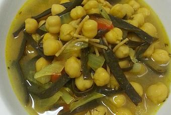 En un perolo vamos a poner rehogar en el aceite el ajo, la cebolla, el pimiento...pasados unos 3/4 minutos añadimos las especias y los garbanzos cocidos (previamente lavados), rehogamos todo junto, añadimos las algas, mezclamos e incorporamos el caldo y el tamari y llevamos a ebullición.