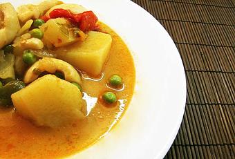 Agregamos las patatas y los guisantes al guiso. Seguimos 20 minutos más a temperatura baja y, al final, le ponemos el pimiento morrón. Dejamos que repose antes de servir.