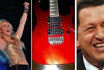 «Shakira le envió al presidente Chávez esta guitarra autografiada», escribió en su cuenta de la red social Twitter el ministro de Información, Andrés Izarra, adjuntando el archivo de la fotografía del instrumento. El pasado marzo, la cantante colombiana visitó Caracas en el marco de su gira latinoamericana «Sale El Sol».«Shakira le envió al Pdte Chávez esta Guitarra autografiada», escribió el ministro venezolano de Comunicación, Andrés Izarra, en su cuenta en Twitter, donde incluyó un enlace a la foto en la que se aprecia el instrumento.El domingo 27 de marzo, durante su programa «Aló presidente», Chávez anunció que la cantante le había solicitado una audiencia pero que, lamentablemente, no habían podido hacer coincidir sus agendas.Shakira se encontraba para entonces en Caracas, donde ofreció un concierto en la Universidad Simón Bolívar.(Fuente: Contrainjerencia)