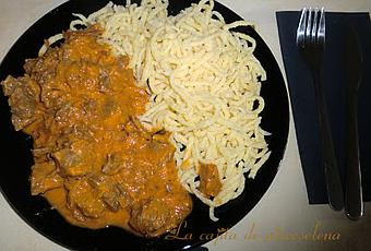 Los spätzle son muy populares por Centro Europa, sobre todo en Alemania y se utilizan sobre todo como acompañamiento de guisos de carne. Este tipo de pasta se hace con harina, sémola y huevo. Los spätzle tienen formas irregulares. Yo, evidentemente no me he complicado tanto en prepararlos frescos, sino que he comprado un paquete de este tipo de pasta en el súper. sólo hay que cocerla, como cualquier otra pasta, en abundante agua con sal.