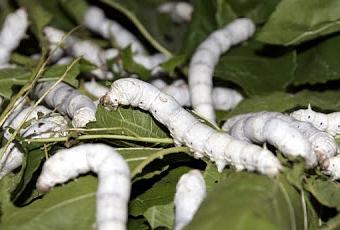 La seda la produce usando como materia prima el almidón de la hoja de morera, y con ella cubre completamente la crisálida con un envoltorio en forma de huevo, que si se desenrollara daría un hilo de más de un kilómetro de largo.