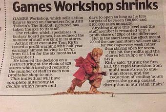 Y las tiendas y marcas de miniaturas?Cuando mas grande es el que cae y de mas altura,mas agujero hace.Y siempre se lleva a gente por delante.Muchas tiendas han hecho a lo largo del tiempo una fuerte inversión en GW en forma de compra de material,de tal forma que han llegado a ser como dije en una entrada "GWdependientes".Por no hablar de todas las mini-empresas y artistas que han conseguido sacar un negocio como algo mas que como un hobby dando a la gente lo que GW no da.Si GW cae,se llevara a muchos por delante.Y en esos sitios yo también tengo colegas y amigos que miran preocupados ese informe y no ven el futuro nada claro.Porque,ademas de usar la guillotina con sus empleados,apretaran mas la turcas a los comercios independientes y harán mas la pascua los de las marcas alternativas.Es el segundo grupo que tengo en mis pensamientos