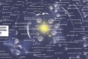Esta imagen que veis representa la "Cosmología de los sistemas de juegos de rol",desde los inicios de los mismos con D&D y los juegos de rol que salieron siguiendo su estela(En especial los de TSR) hasta los retroclones y los juegos de rol que salieron en 2013.Por lo que tenemos un perido de tiempo de casi 40 años representado como si fuera un sistema estelar.D&D viene a ser como una estrella o una nova y los demas juegos van como orbitando a su alrededor colocados en este "sistema estelar" siguiendo un eje doble temporal para que entren todos.Es un poster que han puesto a la venta desde la Gygax Magazine y que hasta mañana esta con precio rebajado de 10 dolares US mas gastos de envío(9 euros mas gastos de envío al cambio actual,aproximadamente).A partir del día 13,costara 15 dolares US mas gastos de envío(Casi 13 euros y medio mas gastos de envío al cambio actual,aproximadamente.).Mide 36" x 24"(Lo que viene a ser 90-91 cm x 60 cm en medidas internacionales),es a color,en papel satinado de alta calidad y se puede encargar desde este link.