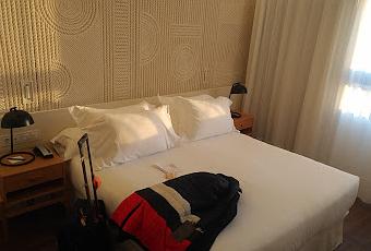 Dentro esa sensación mediterránea continúa. El suelo abandona la moqueta y se convierte en una agradable madera nórdica. A la izquierda de la puerta tenemos dos interruptores de luz y la ranura para meter la tarjeta, todos en blanco -como en el resto de la habitación-. Y allí mismo está el dormitorio. El tamaño es justo, quizá echamos en falta una mesa para trabajar, pero la cama llama tan poderosamente la atención que quién querría trabajar en una mesa habiendo esa cama. Grande, con un comodísimo colchón, seis almohadas de distinta dureza y grosor, vestida con un elegante y suave nórdico de listas. Aparece empotrada contra un bajo cabecero en madera blanca. Sobre ella una pared también blanca hecha como con sogas marinas. Incrustados aquí hay dos pequeños apliques en blanco a modo de potentes reflectores dirigibles para la lectura desde la cama. A cada lado de esta hay sendas mesillas mesillas de madera con cajón. Sobre ambas, sendas lámparas metálicas en negro. En una de las mesillas hay un teléfono, un bolígrafo y un bloc de notas. En la otra el mando de la televisión. Interruptores para todas las luces, un enchufe disponible y otro para USB. Además hay un interruptor que activa el ventilador de madera que hay en el techo. En la pared del fondo hay una ventana de aluminio azul con vistas aquí a la piscina y al Teatro de Tarragona, allí cerca al mar, y allá lejos a la zona industrial. Luz a raudales. Protegida por un foscurit blanco y un visillo en el mismo tono no impiden que la luz de la mañana se cuele en el dormitorio. Bajo la ventana hay una pequeña mesa redonda, baja con otra lámpara a juego con las de las mesillas, con varios avisos sobre seguridad sanitaria del hotel y una caja de bombones de cortesía. El juego de luces es muy agradable y la sensación es suave y relajante. En el techo hay una moldura de escayola que recoje una tira de led que rodea todo el dormitorio, quizá algo fría.