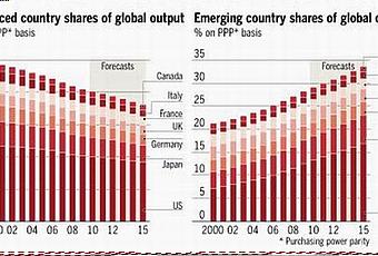 El terremoto financiero ha dañado fuertemente a las economías occidentales, dejando en pie solo a las economías emergentes, principalmente las asiáticas (China, India y Rusia), y tal vez Brasil, dentro de las emergentes latinoamericanas. Pero la fuerza del temblor barrió con el prestigio occidental, y con la dominación económica y espiritual del mundo que encabezó occidente durante los últimos dos siglos. La hegemonía occidental ha llegado a su fin y, como muestran los gráficos, las economías avanzadas han dado inicio a su proceso de declinación, mientras las economías emergentes comienzan un leve pero incierto ascenso.