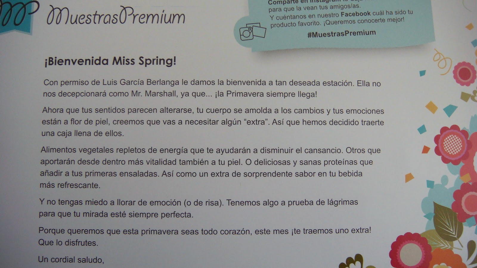 * Porque todos los productos van muy bien embalados y presentados para que lleguen a tu casa en perfecto estado. Es algo que me encanta de esta cajita, los productos llegan envueltos con sumo cuidado y esmero, y muy bien presentados...da gusto abrir esta caja!!. Me llega a través de Zeleris en perfecto estado y se preocupan de llamarme para ver si estoy en casa o comprobar la dirección completa.Este mes de Marzo, Muestras Premium lo quiere dedicar a la tan ansiada primavera, esa que acaba de entrar por la puerta, no sin algo de inestabilidad climatológica, todo sea dicho...los productos de esta caja están repletos de energía que nos ayudarán a disminuir el cansancio y a aumentar la vitalidad. También quieren hacer de nuestro baño, un momento placentero y estimulante, pero eso sí, perfectas y con unas pestañas infinitas y resistentes al agua.Comenzamos a ver los productos más detenidamente... 1. Garbanzos con Espinacas Litoral.- Una receta tradicional y típica de nuestra gastronomía pero elaborada solo con ingredientes naturales y aceite de oliva. Bajo valor calórico por ración. La caja contiene una lata de tamaño real, con 425grs.A mí marido le encantan este tipo de recetas así que le va a dar uso muy prontito... 2. Pechuga de Pollo en escabeche Casa Matachín.- La carne de pollo es naturalmente rica en proteínas de alta calidad y minerales, y muy recomendada en dietas bajas en grasas. Esta receta se puede añadir a ensaladas, pastas o arroz, de forma rápida y fácil. Se incluye el producto a tamaño real, dos latas de 90grs c/u.La verdad es que nunca he probado el pollo enlatado, ni en escabeche pero alguna vez tendrá que ser la primera...mañana tenía pensado cocinar pasta, así que se lo añadiré, a ver que tal. 3. Shandy Naranja Cruzcampo.- Es una equilibrada combinación de cerveza y naranja con lo mejor de cada uno. El resultado es una bebida refrescante, con sabor agradable, suave y fácil de beber. Se incluyen dos latas de tamaño real de 33cl c/u.Estas cervezas me las beberé yo porque a mi marido le gustan más los sabores tradicionales de las cervezas y algo más fuertecitas... 4. Vidactiva- Leche de almendras Vivesoy.- Exquisito y delicado sabor de la de la leche de almendras que te ayuda a disminuir el cansancio y la fatiga gracias a su aporte de hierro. Se incluye producto real. Brick 1litro.Para mí sin duda, me encanta la leche de almendras!!!. 5. Pielvital Bebida de avena.- Te ayuda a cuidar tu piel gracias a su aporte en Biotina, la cual contribuye al mantenimiento de la piel en condiciones normales, dentro de una dieta sana y equilibrada y un estilo de vida saludable. Se incluye producto de tamaño real. Brick 1litro.Igual, a mí me encanta la avena, los cereales y todo lo que sea natural... 6. Acqua Lash Máscara de Pestañas water proof de Ego Professional.- Una máscara profesional para dotar de longitud y cuerpo a las pestañas durante mucho más tiempo, porque tiene una fórmula resistente al agua que te garantiza una mirada perfecta, inmune a la humedad y las emociones. No tiene parabenos. Se incluye producto real.Evidentemente todavía no la he probado, pero realizaré la correspondiente review dentro de poco...estoy deseando probarla!!. 7. Corazón Mega Burbujas.- Por último, acabamos con una baño placentero y estimulante gracias al corazón efervescente que nos envía Muestras Premium. Viene en varias fragancias como lavanda, miel y camomila, glitter musk, Menta fresca, chocolate -coco...et. A mí me ha tocado de rosa y estoy desando relajarme...Debes saber que cada mes recibes tu cajita mensual cómodamente en casa y que si deseas cancelar la suscripción, puedes hacerlo en el momento que desees y sin ningún tipo de penalización.Además, tras probar los productos que te envían, puedes evaluarlos mediante encuestas y así conseguirás puntos canjeables por descuentos que podrás aplicar en los siguientes pedidos.He de aclarar que para que os quedéis tranquilas, esta cajita lleva productos recientemente envasados y con una amplia fecha de caducidad.Y os cuento una última cosa para animaros...
