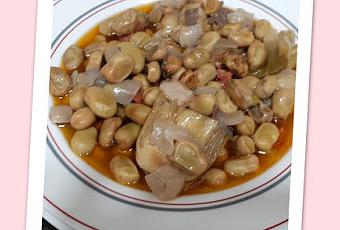 Estas habas me las enseñó hacer mi abuela y si tenía menta fresca también le ponía una hoja a las habas para aromatizarlas.INGREDIENTES PARA 6 PERSONAS:2 paquetes de 400 g de habas1 trozo de butifarra negra1 trozo de chorizo picante1 trozo de tocino ibérico2 cucharadas de manteca de cerdo1 manojo de cebolletas2 alcachofas1 pastillas de caldo de carne1 tetrabrik de vino blancoELABORACIÓN:Introduciremos media hora antes la manteca en una cazuela y las habas para que se descongelen. Añadir todos los ingredientes a trocitos y la pastilla de caldo, añadirle el vino y un poco de agua y cocerlas bien. También si no se le quiere añadir el chorizo y la butifarra mi abuela le ponía trozos de sobrasada y quedan muy buenas.