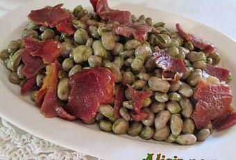 - Habas frescas 1500 g. (con cáscara)- Jamón serrano 150 g.- Aceite de oliva abundante (para cubrirlas totalmente).