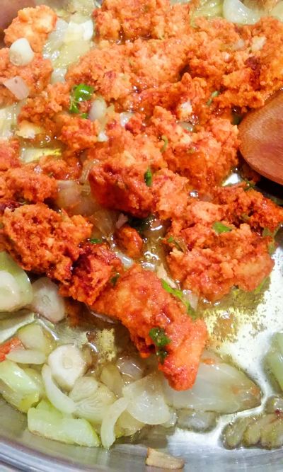 Añade este majado a la cebolla que teníamos en la cacerola. Remueve y espera un par de minutos a fuego lento.