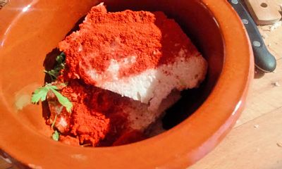 Maja en un mortero las rebanadas de pan, el comino, pimentón, vinagre , perejil y un poco de agua.