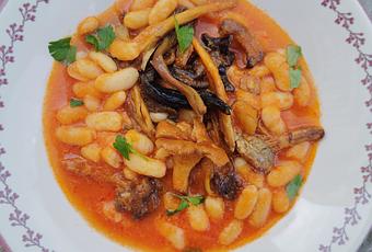 Incorporar las setas a la cacerola junto con las habichuelas blancas, dar dar un hervor, apartar y dejar reposar unos minutos.