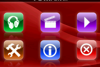 Desde la pantalla principal( figura de más arriba ) ,de izquierda a derecha, de arriba abajo, aquí están las diferentes acciones:Reproducir archivos de audio (s),Reproducir archivos de vídeo,Reanudar último archivo de audio o vídeo,Ajustes (seleccione pieles, opciones …),Mostrar información,Salida.
