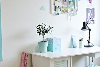 Pues aquí ya podréis ver el conjunto en general. Se trata de una habitación infantil con muchos toques de luz y color. Muebles en blanco, con piezas turquesa, combinación perfecta y sin distinción de sexos. Lamparas que dejan de lado sus tulipas, para quedarse puramente en el esqueleto y ser protagonistas de lugares donde lazos o pájaros se encargan de dar mas protagonismo. Pero además, sobre el escritorio, un mural de fotografías, con un marco y una red de gallinero que junto con esa caja de madera, son el toque vintage. Son sencillos detalles, que hacen mas grande la decoración, no creéis?