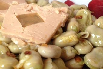 Picamos la cebolla muy pequeña. Escurrimos las habitas y reservamos. Calentamos una sartén con dos cucharadas de aceite. Cuando la cebolla esté pochada incorporamos las habitas y rehogamos unos minutos, Preparamos para emplatar. Enrollamos las lonchas pequeñas de cecina y cortamos en trozos pequeños el foie. Yo he comprado uno relleno de miel de Mercd... y el sabor es sorprendente. Servimos caliente para que se deshaga el foie.
