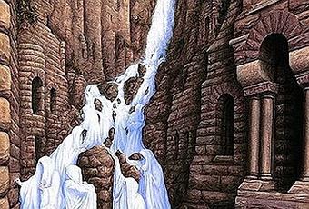 Como ocurre con las palabras polisémicas, en las obras de Rob Gonsalves también encontrarmos dobles significados para una misma imagen. En esta ilustración podemos ver como el agua que baja por el torrente se transforma en diferentes monjes y el torrente a su vez en una especie de monasterio.