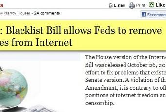 En los EE.UU. un nuevo proyecto de ley denominado Internet Blacklist Bill impediría el acceso a sitios que funcionan a partir de contenidos compartidos como Facebook y Twitter.El Congreso de Estados Unidos empieza el debate de un polémico proyecto de ley que busca bloquear el acceso a varios sitios que funcionan a partir de contenidos compartidos por Internet como Twitter y Facebook.