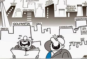 (Composición con varias viñetas de Forges)Admiro en Forges su inagotable capacidad para destilar mala leche en sus viñetas a partir del acuoso licor de la política y la actualidad. Ha creado un mundo propio en sus dibujos, aunque en realidad no inventa nada y un lenguaje peculiar. Siempre me fijé con interés en los letreros de sus edificios, en los carteles de los simplificados bloques de sus ciudades, que son las nuestras. Allí, en los nombres de las empresas "inventadadas" se puede encontrar una variada colección de neologismos relacionados todos con la corrupción, el poder, la usura... Invita a seguir el juego inventándo por nuestra cuenta más entidades financieras "de coña": "Robanquia", "Euroblack", "ManganCía", "Expolia SA", "Si SA", "Malver SA", "Depreda.com", "Timofondo", "Estafalia", "Embaufondos", "United Expolia", "Saqueotrust", "RentaBuitr",, "Corruptalia Resorts", "Canting'Palo Bank"...