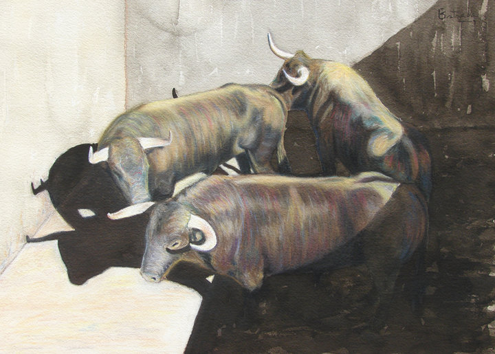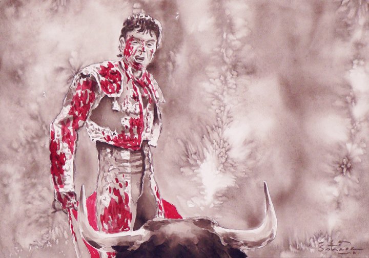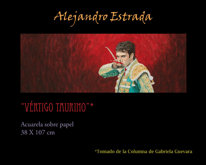 Alejandro tenía preparado por adelantado el dibujo de un torazo. Y en cuanto llegamos al estudio se puso a pintar, hizo de él una acuarela con mucho trapío y bravura. Su pincel estallaba de a poco en el papel, como un pasodoble muy torero. Para terminarla escuchamos La Virgen de la Macarena... Es todo un espectáculo, fue como ver partir plaza al toro. Insisto, llegar al trapío es tal vez una de las cosas más complicadas, pero Estrada va más allá, acierta en cada cuadro donde el toro y el torero danzan este ritual de sangre y de muerte, porque sus manos dejan caer el temple sobre la muleta, y llevan noble y humillado a esos torazos que nos brinda tarde a tarde, cuadro a cuadro.Su obra taurina habla del equilibrio en su afición, no es ni torista ni torerista, es más bien otro hacedor de la Fiesta. En sus cuadros, ciertamente, la verdad del toreo queda al descubierto. El toro, figura mítica de poder, fuerza y divinidad es representado siempre verídicamente, no es la idea de toro, es el toro que parte tarde a tarde nuestras plaza, aquel toro que nos emociona con su trote alegre y un trapío que a veces es un engaño. El torero gallardo siempre, mortal siempre, capaz de subir a la categoría de dios, de héroe, tras una tanda de naturales es un personaje bien estudiado de Alejandro Estrada, porque logra llevarnos al vértigo taurino, al temple, a la temeridad, a la clemencia de una verónica, a fuerza que se desata en una revolera.