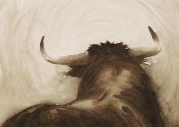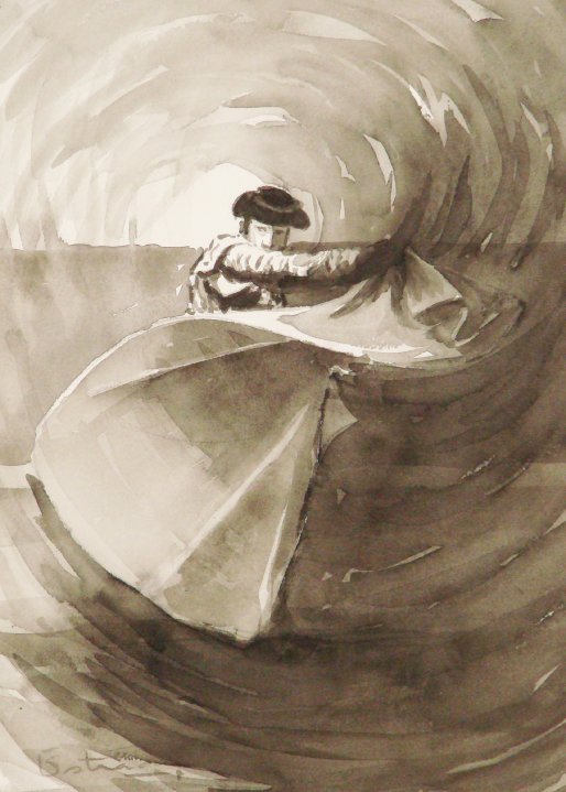 Alejandro tenía preparado por adelantado el dibujo de un torazo. Y en cuanto llegamos al estudio se puso a pintar, hizo de él una acuarela con mucho trapío y bravura. Su pincel estallaba de a poco en el papel, como un pasodoble muy torero. Para terminarla escuchamos La Virgen de la Macarena... Es todo un espectáculo, fue como ver partir plaza al toro. Insisto, llegar al trapío es tal vez una de las cosas más complicadas, pero Estrada va más allá, acierta en cada cuadro donde el toro y el torero danzan este ritual de sangre y de muerte, porque sus manos dejan caer el temple sobre la muleta, y llevan noble y humillado a esos torazos que nos brinda tarde a tarde, cuadro a cuadro.Su obra taurina habla del equilibrio en su afición, no es ni torista ni torerista, es más bien otro hacedor de la Fiesta. En sus cuadros, ciertamente, la verdad del toreo queda al descubierto. El toro, figura mítica de poder, fuerza y divinidad es representado siempre verídicamente, no es la idea de toro, es el toro que parte tarde a tarde nuestras plaza, aquel toro que nos emociona con su trote alegre y un trapío que a veces es un engaño. El torero gallardo siempre, mortal siempre, capaz de subir a la categoría de dios, de héroe, tras una tanda de naturales es un personaje bien estudiado de Alejandro Estrada, porque logra llevarnos al vértigo taurino, al temple, a la temeridad, a la clemencia de una verónica, a fuerza que se desata en una revolera.