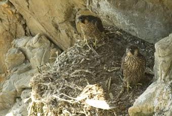 En un acantilado costero del occidente asturiano, dos pollos ya emplumados de Halcón peregrino (Falco peregrinus) están a punto de abandonar el nido. Hace ya 30 días que nacieron y en todo ese tiempo han sido alimentados regularmente por sus padres con palomas y otras aves. Desde hace unos cuantos días, la hembra ya no se encarga de cebarlos y los dos adultos les dejan las presas en el nido para que las coman por si solos. Dentro de unos días los padres empezarán a llamarlos desde las rocas cercanas para animarlos a dar su primer vuelo.