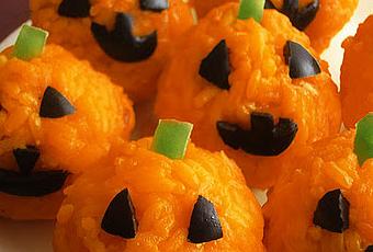 Sólo necesitas arróz, pimiento verde, aceitunas negras, colorante alimentario y sal, porque luego hay que comérselas ¿No?. Los niños se divierten cuando presentas en su plato algo tan curioso y divertido como estas calabacitas de arróz. ¡Y se las comen con un gustito vaya!. Simplemente cueces el arróz, preferiblemente con un poquito más de agua de lo normal, que no se seque tan fácilmente, añades colorante alimentario y sal. Esperas que se cueza y deja reposar hasta enfriar. Cortas las aceitunas con la punta de un cuchillo bien afilado, igualmente el pimiento. Moldea con las manos unas bolitas y con cuidado agrega la sonrisa y los ojos presionando levemente y hunde por encima el trocito de pimiento.¡Que paséis una noche de Halloween divertida!