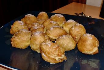 11月1日は諸聖人の日。カトリック教会の祝日の一つで、全ての聖人と殉教者を記念する日で、スペインでは祝日です。この日は墓参りをする習慣があるため、花屋さんは大忙し。また、ブニュエロ(ミニシュークリーム)やウエソス・デ・サント(聖人の骨、という名前にあるように、まさに見た目は骨。マジパンのお菓子)を食べる、という習慣もあり、だいたい1週間前ぐらいからパン屋さんではこれらが登場。でも、これ意外と高い。ということで今年はブニュエロなしの祝日、と思っていましたが、友達がFACEBOOKで自作ブニュエロの写真をアップしているのを見て、闘志が・・・。ということで今年は初・ブニュエロ作りに挑戦。作り方は超簡単。鍋に水と牛乳を入れて熱し、沸騰したら、バター、小麦粉を入れかき混ぜます。その後、火から下ろし、卵を入れ、さらにかき混ぜます。これで生地完成。その後、生地を油で揚げます。きれいな丸にするのが難関・・・。その後、カスタードクリームを中に入れ、上から砂糖をまぶし、完成。非常に時間はかかったけど、美味しくできました。