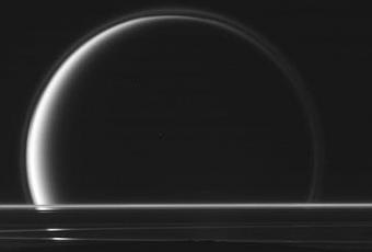 El halo de la atmóstera de Titán es perfectamente visible en esta fotografía. Incluso se puede distinguir el disco oscuro de Encélado en la parte inferior de la imagen