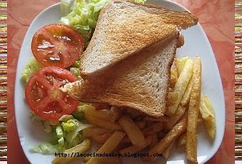 Poner una tostada encima de un plato, encima una hamburguesa con la loncha de queso, un rodaja de tomate, otra hamburguesa con su queso correspondiente y unas lonchas de bacon.. se cierra con otra tostada.. se acompaña con lechuga, tomate y patatas...
