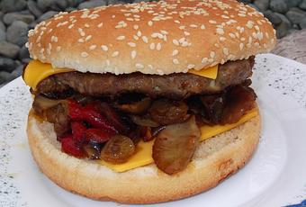 Ingredientes:- 2 panes de hamburguesas.- 160 gramos de carne picada (mitad magro de cerdo, mitad ternera).- Ajo, sal y perejil para preparar la carne.- Media cebolla.- 50 gramos de setas.- 4 pimientos del piquillo.- 2 dientes de ajo.- 4 lonchas de tranchetes tipo cheddar.- Mayonesa de soja:o 300 mililitros de aceite de girasol.o Medio limón.o Sal.o 1 huevo. o Un chorro generoso de soja.
